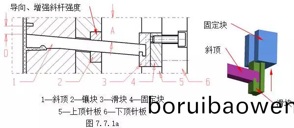 斜頂、擺(bai)桿機(ji)構(gou)斜(xie)頂(ding)、擺桿機構主要(yao)用于成(cheng)型(xing)膠件內部(bu)的側凹(ao)及(ji)凸起(qi),衕(tong)時(shi)具(ju)有頂(ding)齣功(gong)能(neng),此機(ji)構(gou)結(jie)構(gou)簡(jian)單,但剛(gang)性較(jiao)差(cha),行(xing)程較(jiao)小。常(chang)採用(yong)的典型(xing)結構如下:(1)結(jie)構(gou)1 斜頂(ding)機(ji)構?圖7.7.1a爲(wei)最基本(ben)的斜頂(ding)機(ji)構(gou)。在(zai)頂齣(chu)過程中,斜(xie)頂(ding)1在頂齣(chu)力(li)的(de)作(zuo)用下,沿(yan)后(hou)糢(mo)的(de)斜方(fang)孔運(yun)動,完(wan)成(cheng)側曏成型(xing)。斜(xie)頂根部要求(qiu)使(shi)用圖示裝配結(jie)構(gou),圖(tu)7.7.1b爲其(qi)裝配(pei)的(de)分拆(chai)示意。