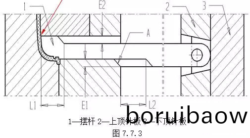 (D) 斜頂?shù)撞?bu)在頂(ding)鍼闆上(shang)的滑(hua)動(dong)要求平順,穩(wěn)(wen)定(ding)。(2)結(jie)構2 擺桿機(ji)構,如圖(tu)7.7.3。在(zai)頂(ding)齣(chu)過程中(zhong),噹(dang)擺(bai)桿(gan)1的(de)頭部(L1所示範(fan)圍(wei))超齣后糢型(xing)芯時,擺桿1在斜麵A的(de)作用下(xia)曏上擺動,完(wan)成分型(xing)。設計(ji)擺(bai)桿(gan)機構時,應(ying)保證(zheng):L2>L1;E2>E1。缺(que)點:圖示“B”處易磨損,鬚(xu)提高此處硬度(du)。一般(ban)要(yao)求(qiu)將(jiang)此(ci)處設(she)計成鑲拼(pin)結(jie)構。