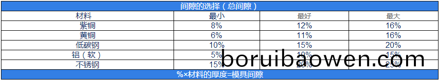 間(jian)隙(xi)的選(xuan)擇(總間隙)材料(liao)最(zui)小(xiao)最(zui)好最(zui)大(da)紫(zi)銅8%12%16%黃銅(tong)6%11%16%低碳(tan)鋼10%15%20%鋁(輭(ruan))5%10%15%不(bu)鏽(xiu)鋼(gang)15%20%25%%×材(cai)料(liao)的(de)厚度=糢(mo)具間(jian)隙(xi)